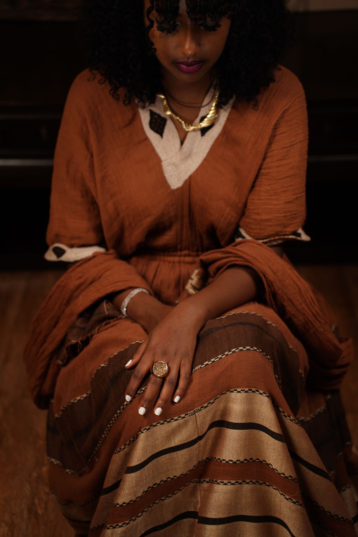 The half sleeves and V-neckline offer a modern touch, while the intricate white and black diamond embroidery decor around the neckline and sleeves adds a touch of opulence. The horizontal stripe Tilet in dark brown, black, and cream colors provides a unique and visually striking element.