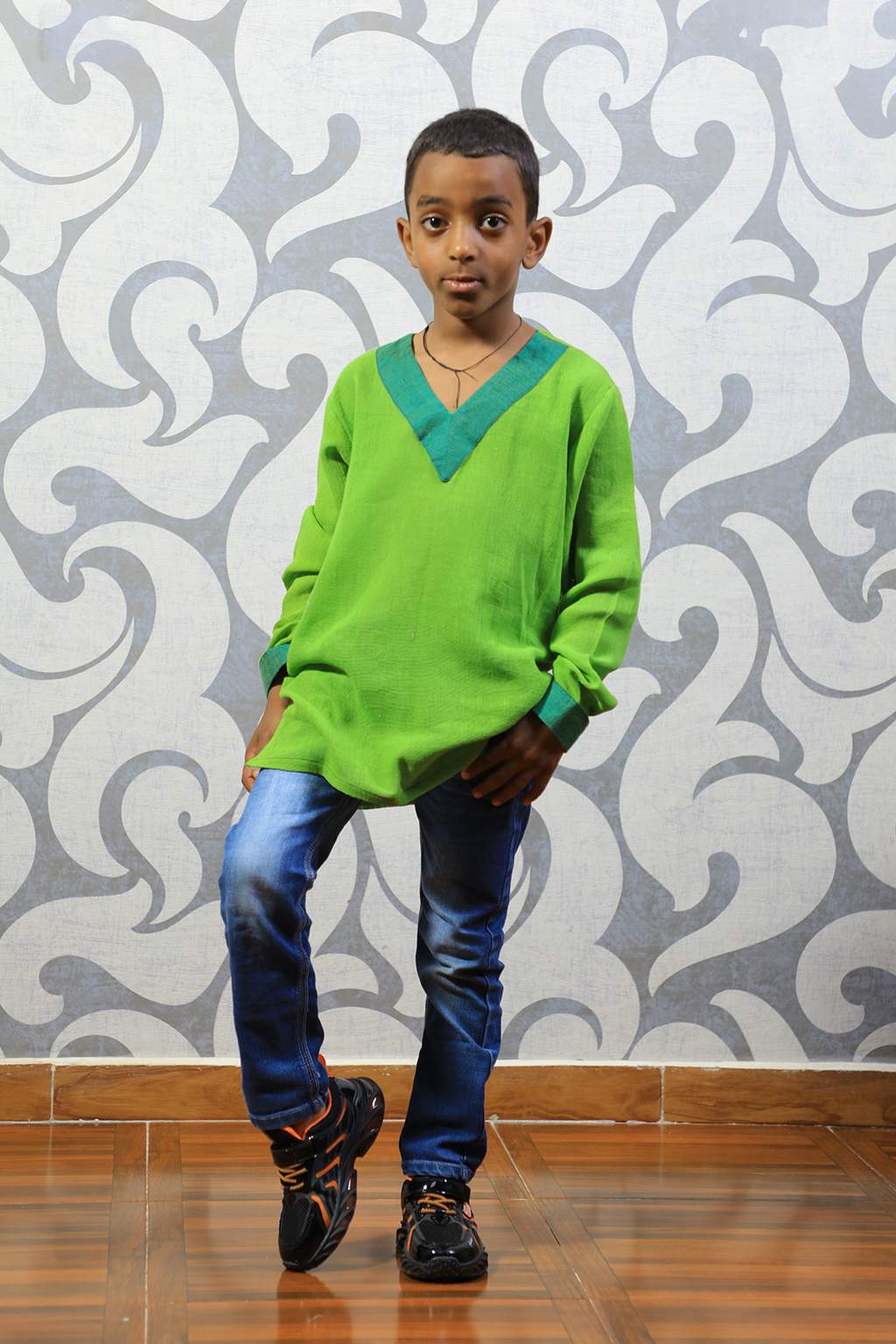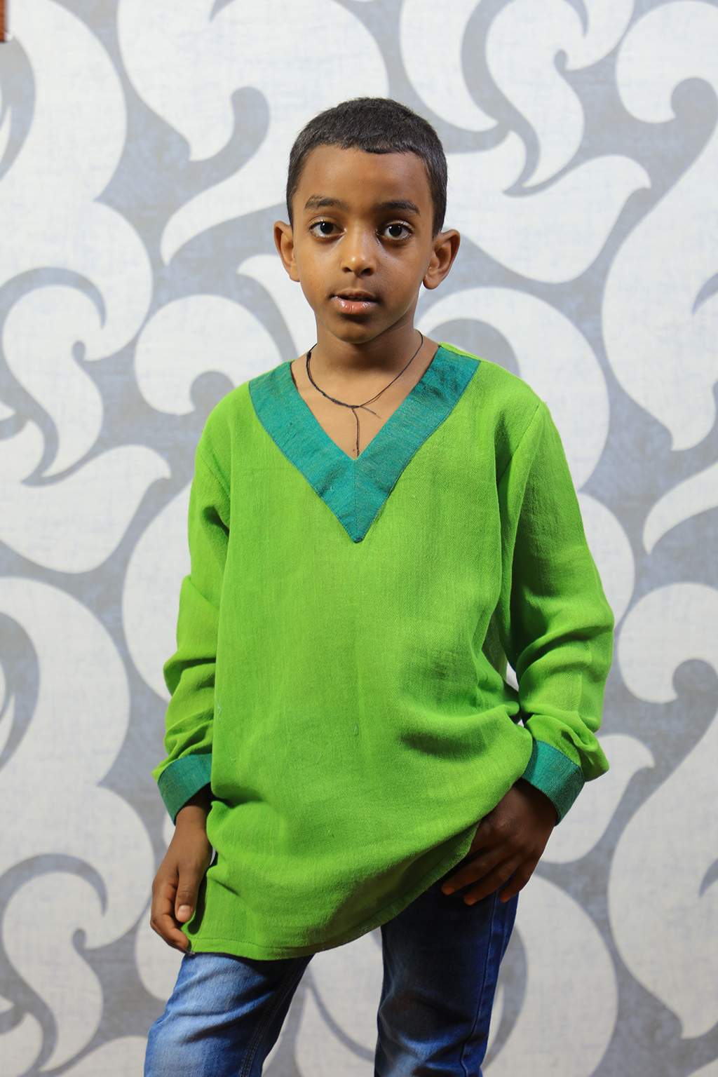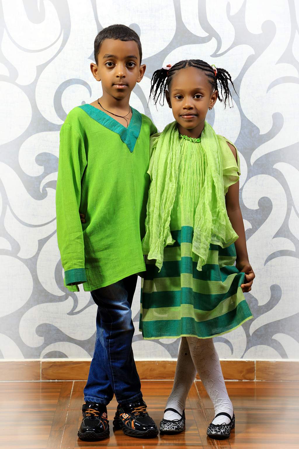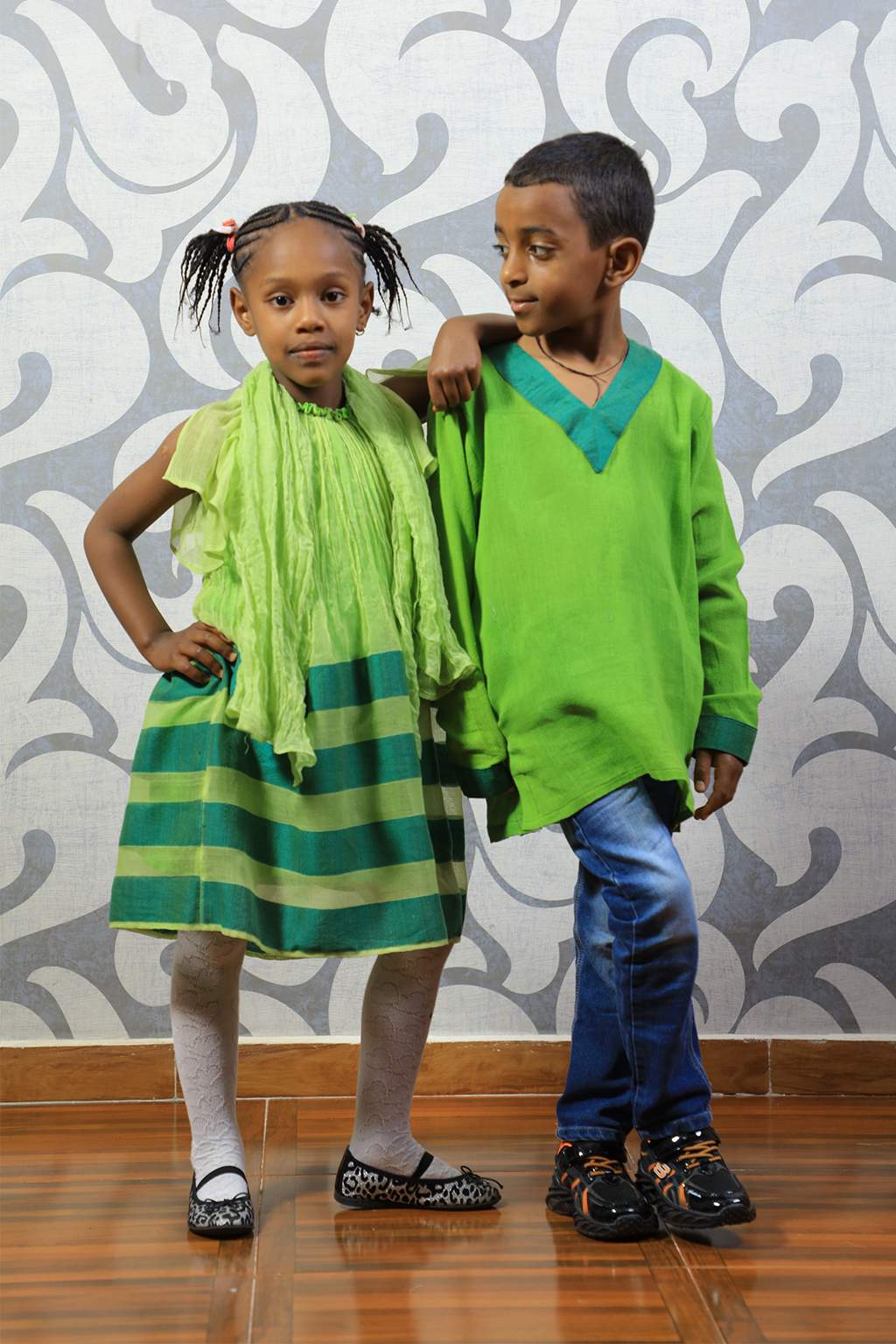 Green boy’s top and girls dress with Dark green Tillet