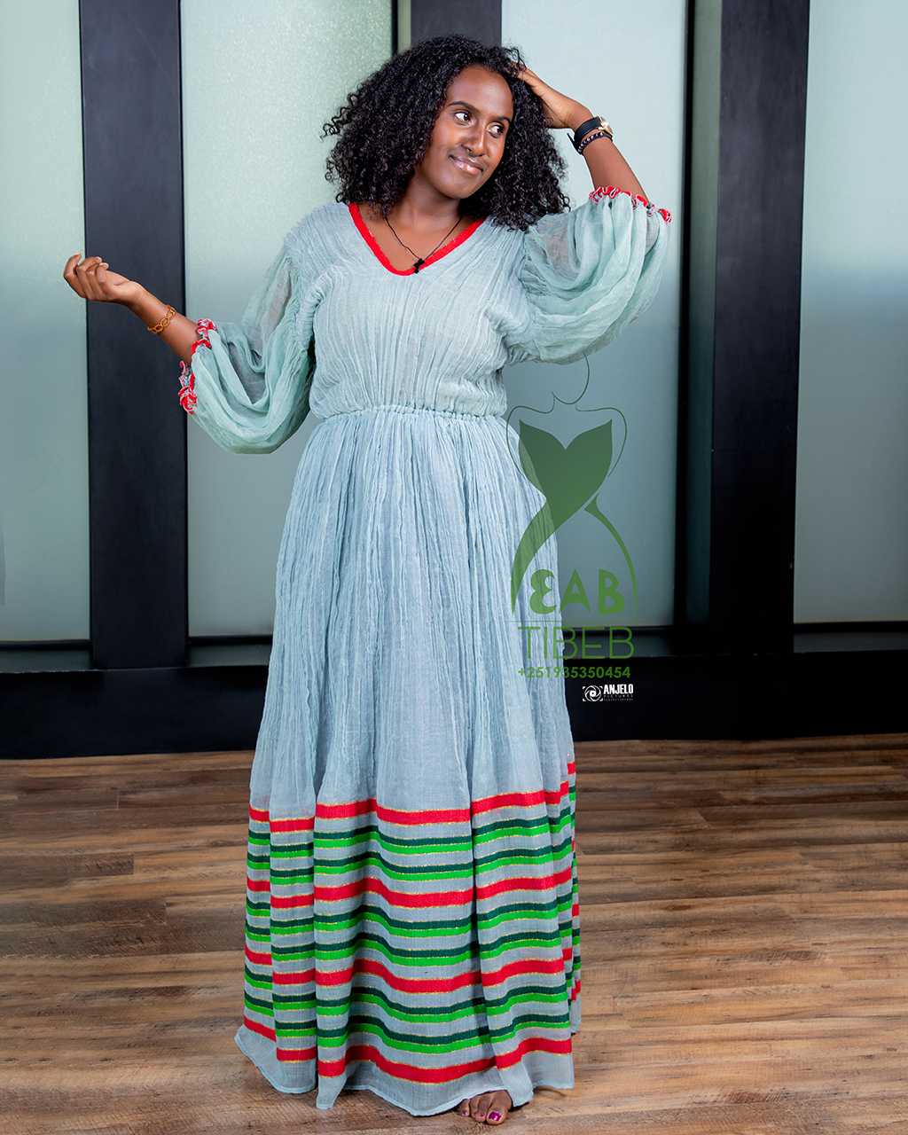 Light blue long dress with red and green Tillet