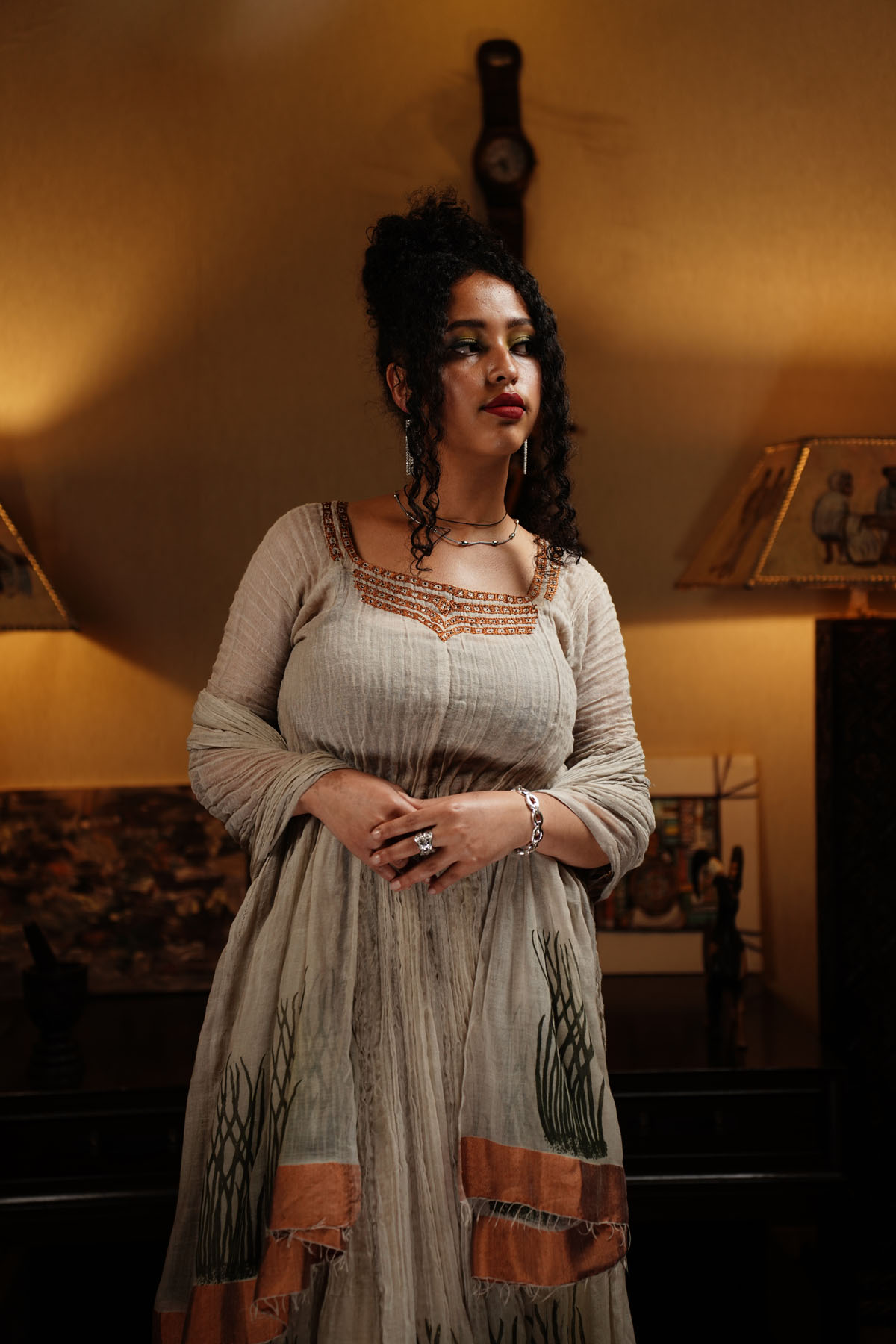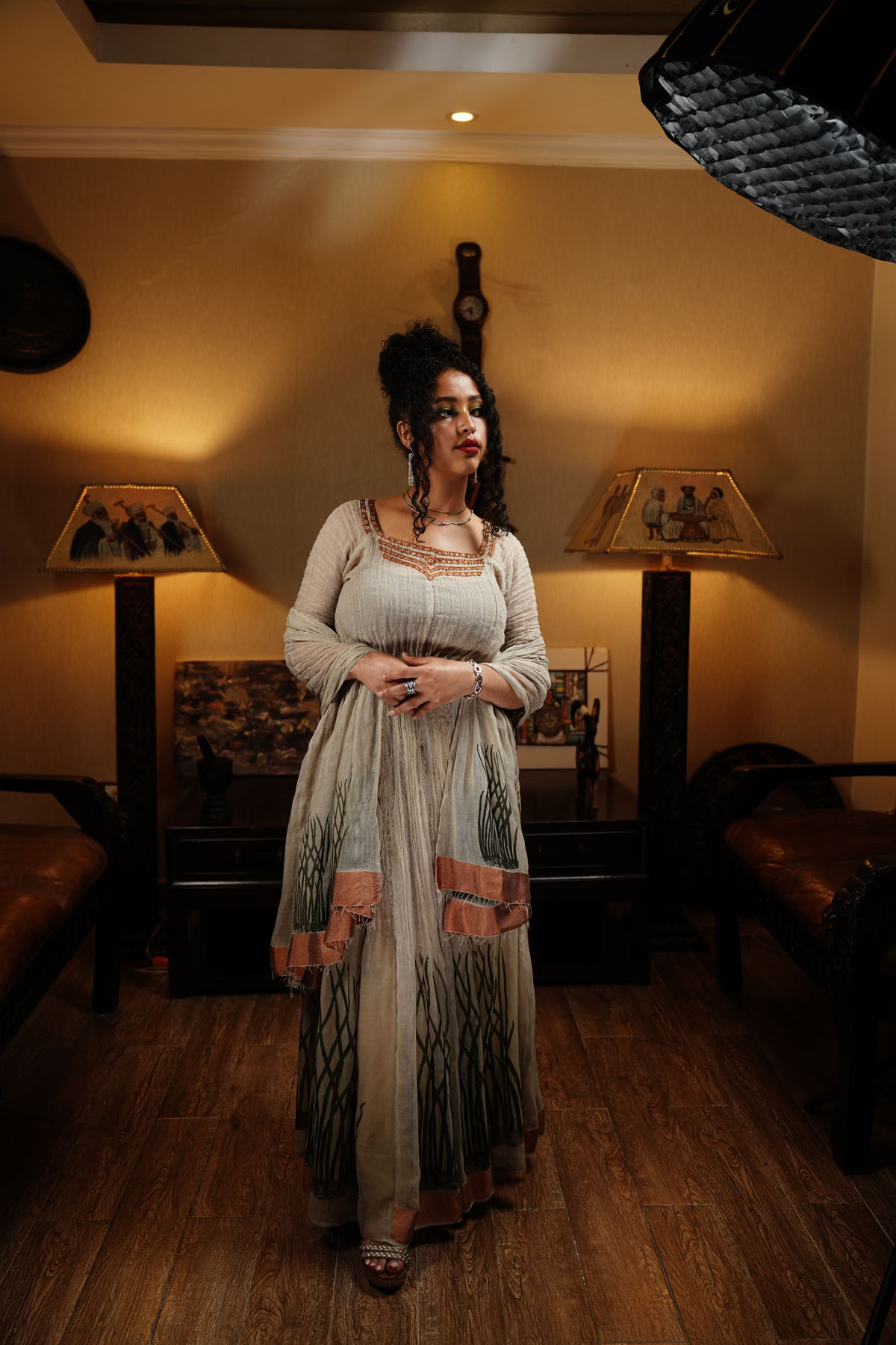 The included small Netela scarf adds a touch of traditional elegance to this contemporary masterpiece. Our long cream Tibeb dress is a perfect fusion of heritage and modern style, ideal for special occasions or everyday wear.