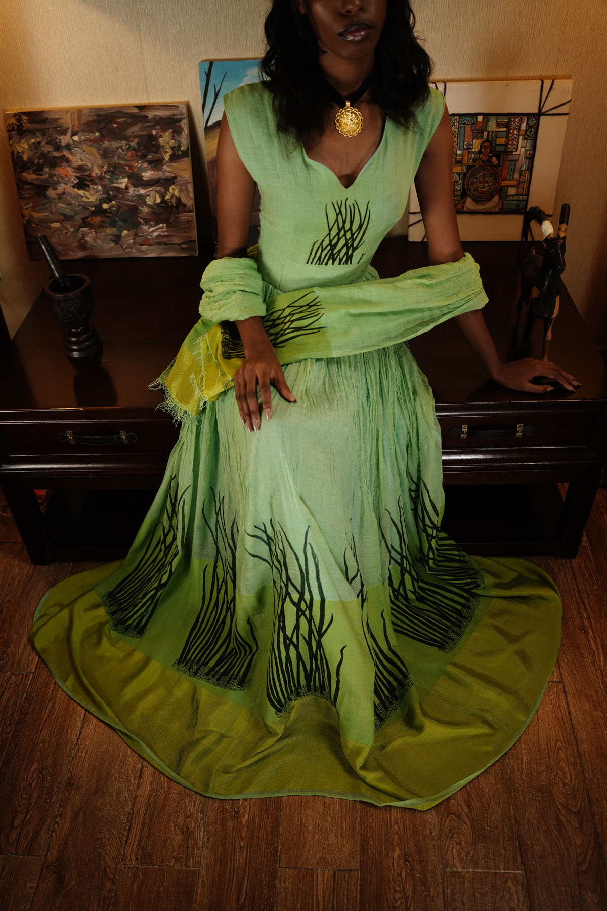 Features: Sleeveless, V neck at front. It have a Lemon and light green horizontal stripe decor (Tilet) at bottom and long grasses print decor at chest and around the bottom of the dress.
