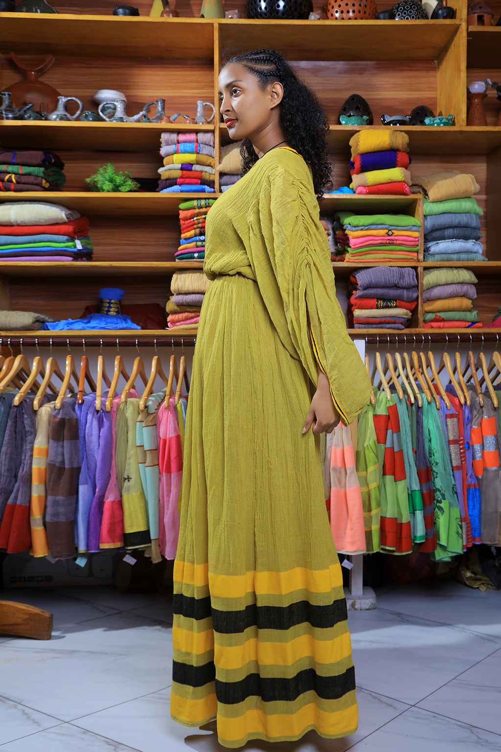 Yellow Green Ethiopian new year colored Long dress with black and yellow stripe Tillet